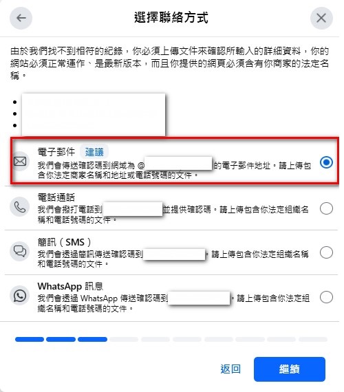 選擇聯絡方式 > 系統建議「電子郵件」> 選擇完,接著按「繼續」