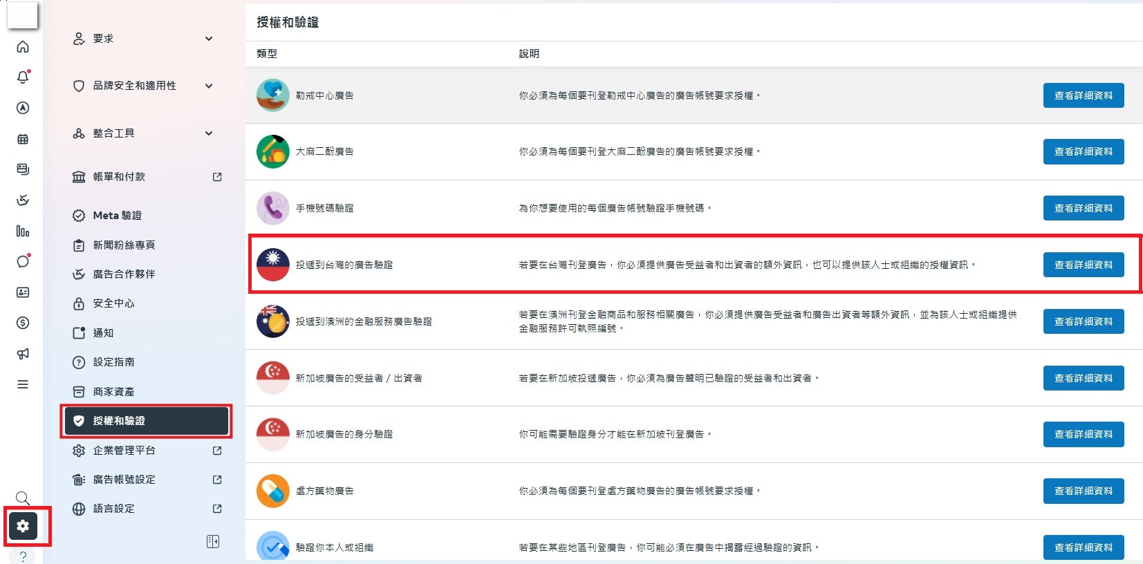 進入Meta Business Suite > 左側下方設定 > 功能列授權和驗證 > 選擇投遞到台灣的廣告驗證 > 查看詳細資料