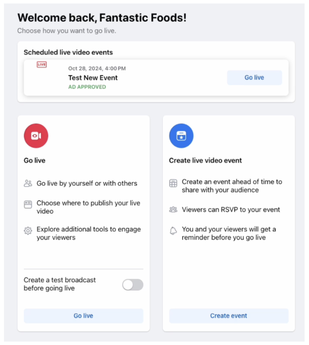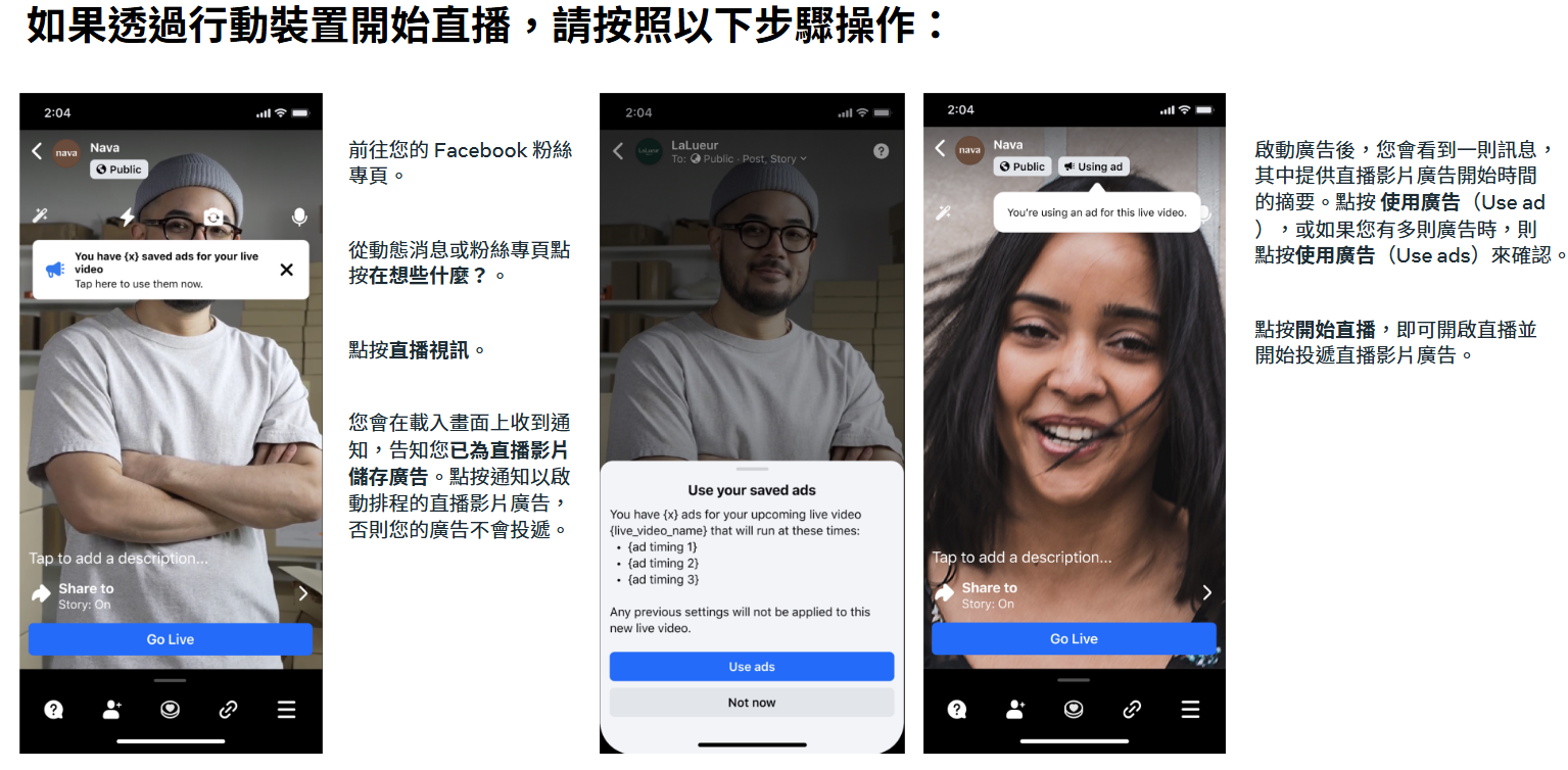 Meta 會主動審核您的廣告和粉絲專頁,以協助您判斷自己是否符合建立和刊登直播影片廣告的資格。若您的廣告未遵守《Meta 廣告刊登準則》,或直播內容不符合 Facebook Live 政策和守則,您將無法建立直播影片廣告。