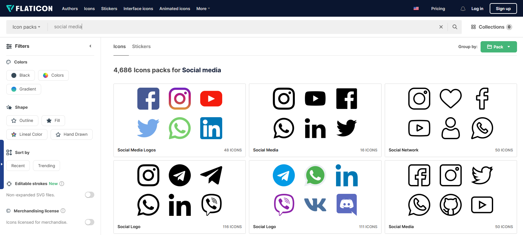 如下圖所示,在方框中的位置修改搜尋條件為「Packs」後,一樣鍵入「social media」搜尋,就可以獲得一組組已經整理好的圖示,每一組的社群媒體icon風格都相同,與上圖相比,搜尋結果更整齊清楚。