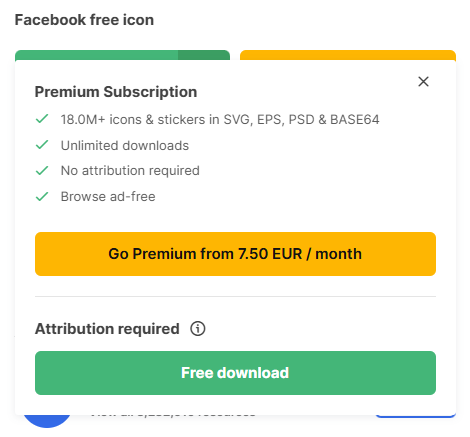 flaticon有提供每月的付費訂閱服務,可以下載更多專業版icon(有皇冠標記的icon均需付費)並客製化icon的顏色,假如不想付費,可點選右方綠色的免費下載;不過若是使用在商業用途,要將上方的連結複製在簡報中,標示圖片來源即可使用,這部分雖然沒有強制,但屬於自由心證範圍,為尊重創作者,建議大家若使用這些icon在商業用途,仍要記得標註圖片來源。