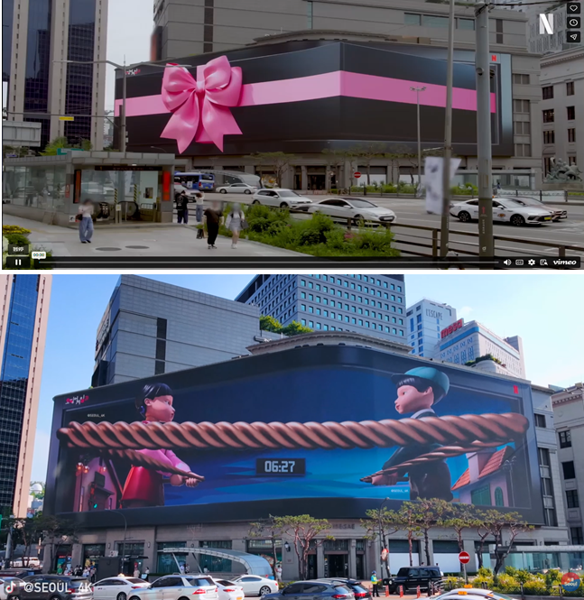自 2021 年《魷魚遊戲》掀起全球熱潮以來,Netflix 每季宣傳皆以大型沉浸式裝置與強烈視覺語彙引爆話題。今年 6 月,第三季開播前於韓國新世界廣場推出 3D 立體戶外廣告牌,以「開箱」概念重現遊戲世界的張力。螢幕開場是一個緊鎖的禮物盒,隨著包裝自動開啟,主角現身並選出 456 號玩家,象徵遊戲重啟;接著旋轉跳繩、爆裂金豬與飛散鈔票依序登場,串連起觀眾熟悉的經典符號。整體以「劇情預告 × 感官震撼」為核心,運用 3D 技術延伸故事場景,讓粉絲在現實空間中體驗魷魚宇宙的回歸,成功掀起全球討論熱潮與開播期待。