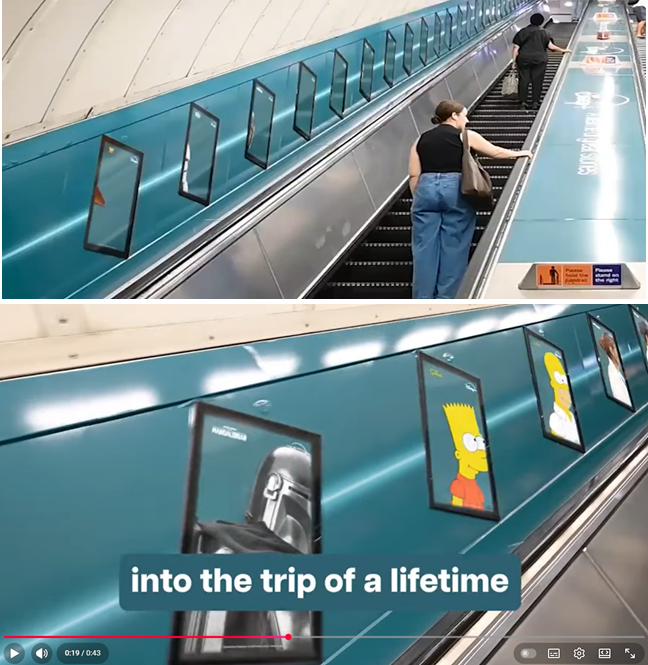 最出色的戶外廣告,往往能巧妙融入環境、喚起人們的情緒共鳴。Disney+ 於倫敦邦德街地鐵站推出創意數位廣告,將日常通勤化為「與角色同行」的奇幻體驗。活動運用動作追蹤技術,讓自動扶梯上的螢幕與乘客動作同步,每位路過者都會匹配到一位迪士尼角色。角色會隨現場情境即時互動——列車進站時提醒「嘘!劇情要開始了!」,人潮擁擠時則露出俏皮表情或揮手逗趣。整體以「讓魔法發生在最日常的地方」為核心概念,讓繁忙通勤增添驚喜與笑聲。此案例不靠炫技,而以幽默互動與情感共鳴,展現 Disney+ 品牌一貫的魔法溫度與陪伴感