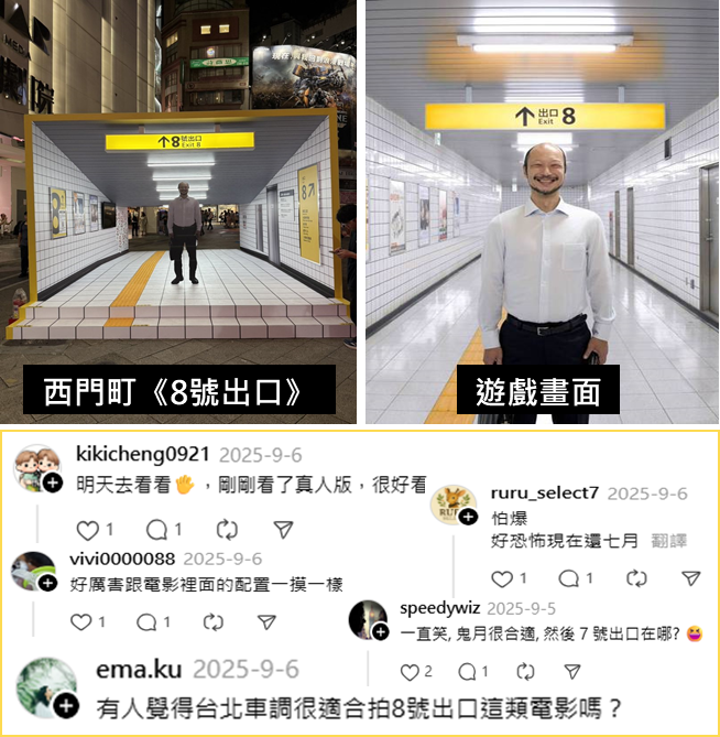 電影《8號出口》改編自全球熱賣的恐怖遊戲,連續兩週在日本熱映,票房突破21億日圓。為延續話題熱度,台灣片商選擇於西門捷運6號出口對面打造「實體8號出口」裝置,真實還原電影中主角迷失的捷運走道與詭異人像,讓路人彷彿置身恐怖遊戲現場