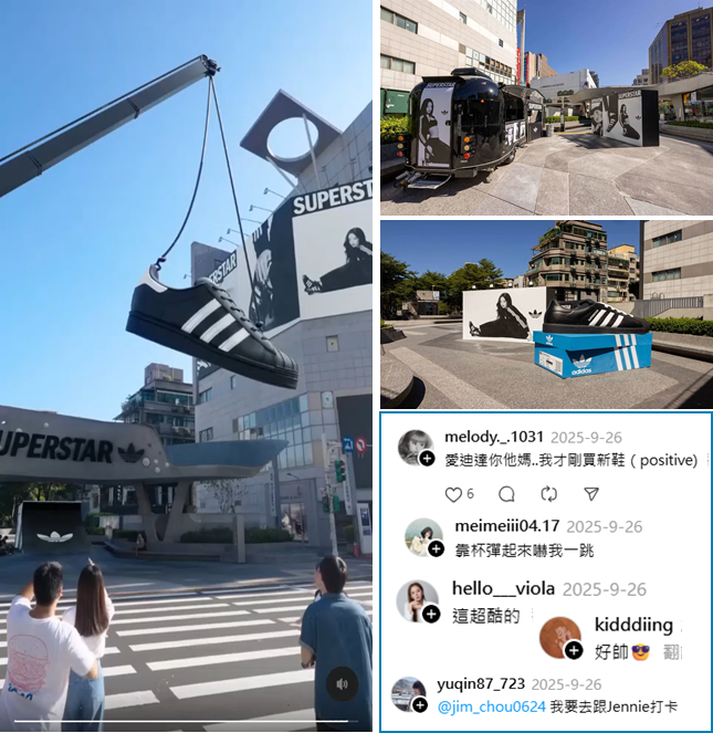 另外,CGI結合線下街區成為近年品牌常見的混合實境操作,品牌釋出超現實 CGI 影片與 Jennie 廣告車巡迴街區,線上線下互相呼應,讓 SUPERSTAR 從影像世界走入真實街頭。活動期間吸引大量粉絲與民眾拍照打卡,社群討論熱烈。adidas 以創意視覺與沉浸式體驗,成功讓經典鞋款 SUPERSTAR 再度成為城市潮流話題核心,展現品牌持續「經典向前」的原創力量。