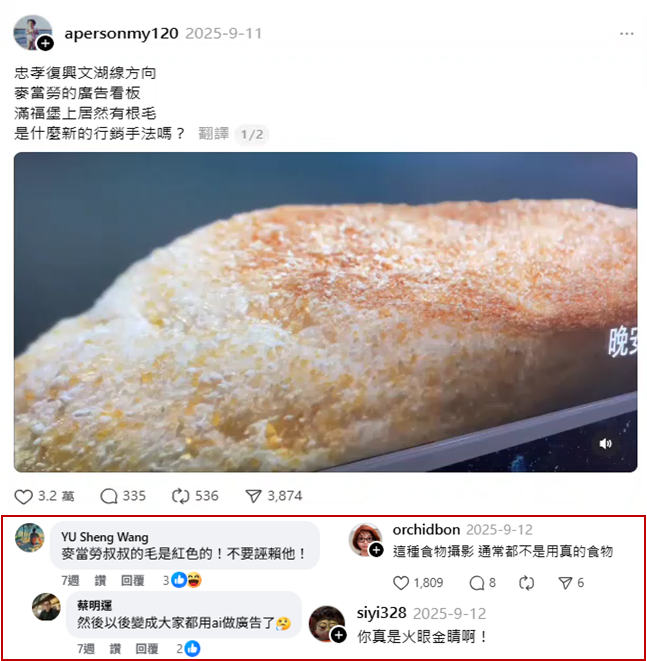 一名網友在社群平台「Threads」貼文指出,「北捷忠孝復興文湖線方向,麥當勞的廣告看板上面的滿福堡,居然有一根毛,這是什麼新的行銷手法嗎?」只見貼出的影片,該網友把廣告看板麵包細節放大之後,發現滿福堡上面真的有一根黑色的捲毛。