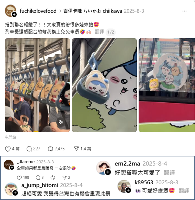一名網友在 Threads 分享:「搭到聯名輕軌了!!大家真的帶很多娃來拍」,貼文隨即突破 91 萬次觀看,再度證明IP不只是角色,更是跨城市、跨文化的情感連結符號。