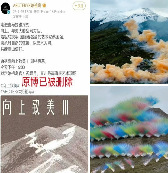 戶外品牌始祖鳥(ARC’TERYX) 成立於加拿大,2019 年隨母公司亞瑪芬體育被中國安踏體育併購。2025 年,品牌與中國藝術家蔡國強在喜馬拉雅山區舉辦煙火藝術計畫,原意為展現「人與自然的對話」,卻因選址位於西藏日喀則生態敏感區而引發輿論爭議,被網友批評為「炸山行為」
